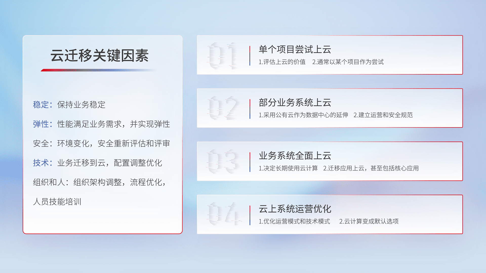 结合实际业务,,,,从规划设计、、、云平台选型、、、云原生改造、、数据迁移、、、集成交付,,,,迁移全过程为客户识别最佳上云路径,,,做好风险识别管理,,,,设计网络架构、、身份权限、、、、安全审计合规、、、、操作审计、、、日志审计、、、、监控告警策略、、、多站点容灾设计等,,,,对云上基础设施进行整体规划,,提升IT治理水平,,,以满足弹性、、高可用、、、高性能的需求。。。