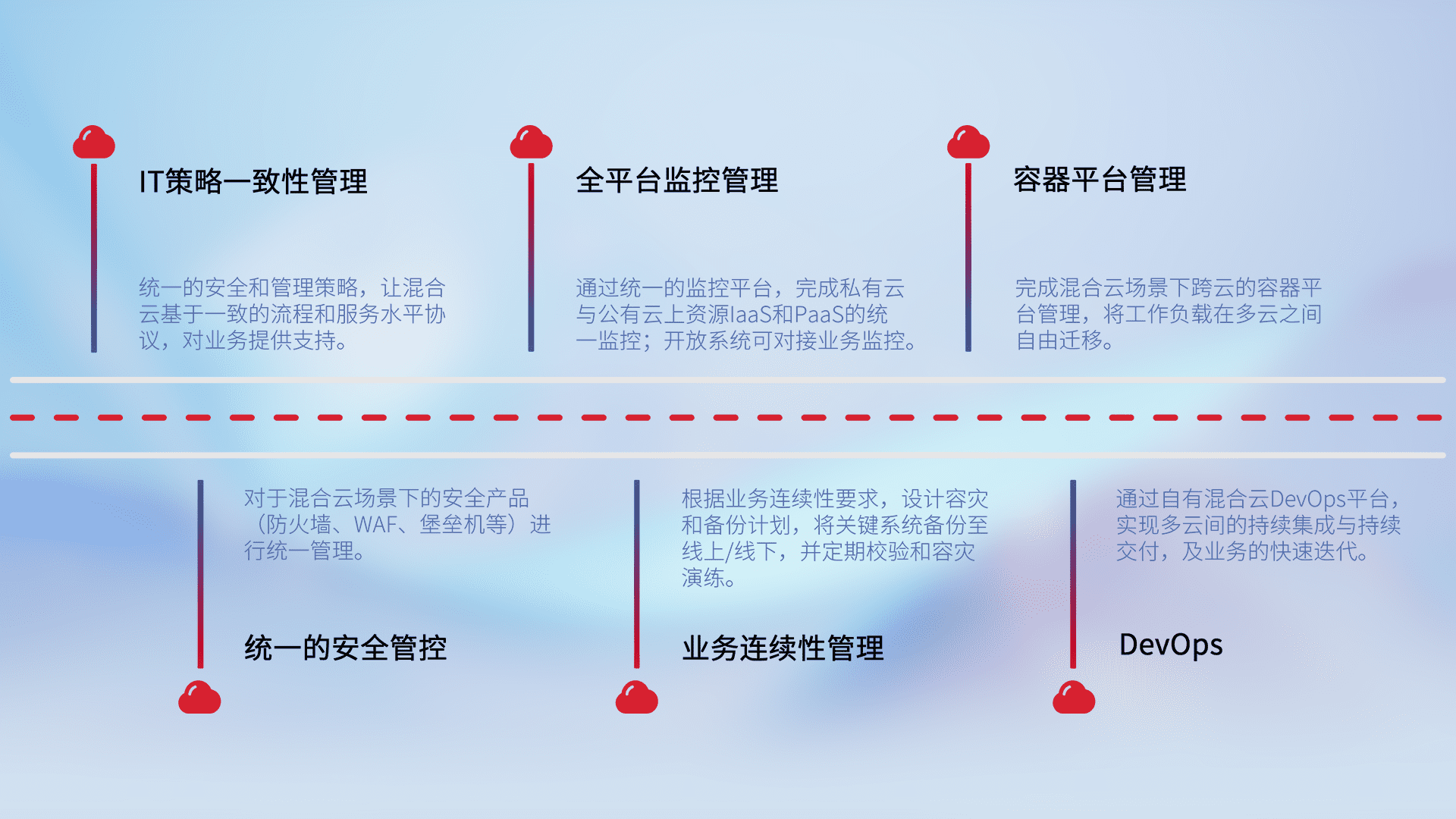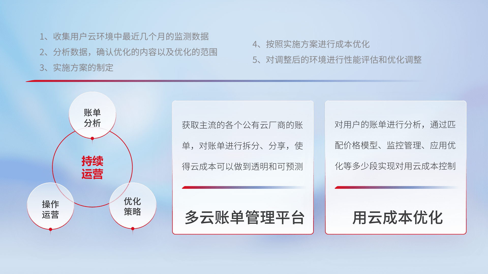 通过多云纳管,,,以统一的资源数据模型把客户的云资源进行抽象和封装,,进而实现对多云资源的统一操作,,保障云资源管理的可靠性、、、稳定性与可用性。。量身定制化运维内容,,,,配置、、开发运维、、、、补丁管理、、、、备份、、、、监控、、认证和访问管理、、、、审计和日常巡检等,,保障在用云过程中的可靠度,,稳定度以及高可用率。。。。