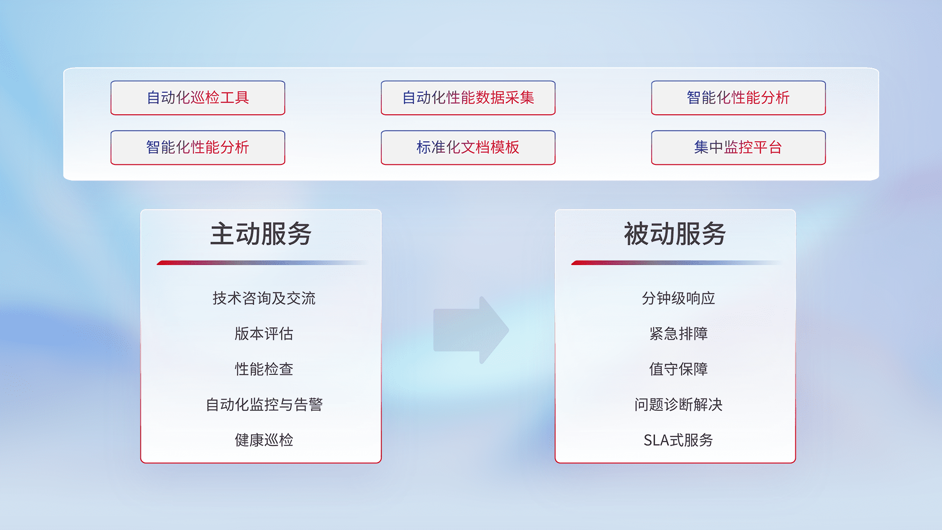 智能化工具和标准化文档,,,,保障服务质量,,提供主动服务(包含技术咨询、、版本评估、、、性能检查、、自动化监控与告警、、、健康巡检)和被动服务包含(分钟级响应、、紧急排障、、值守保障、、、问题诊断解决、、、、SLA服务)。。